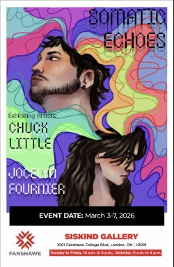 Somatic Echoes brings together the work of Jocelyn Fournier and Chuck Little, two artists exploring the complex relationship between the physical form and the internal self. Through a shared language of vibrant abstraction and intense layering, their work attempts to explore the gap between the person we see in the mirror today and the long history we carry inside us.